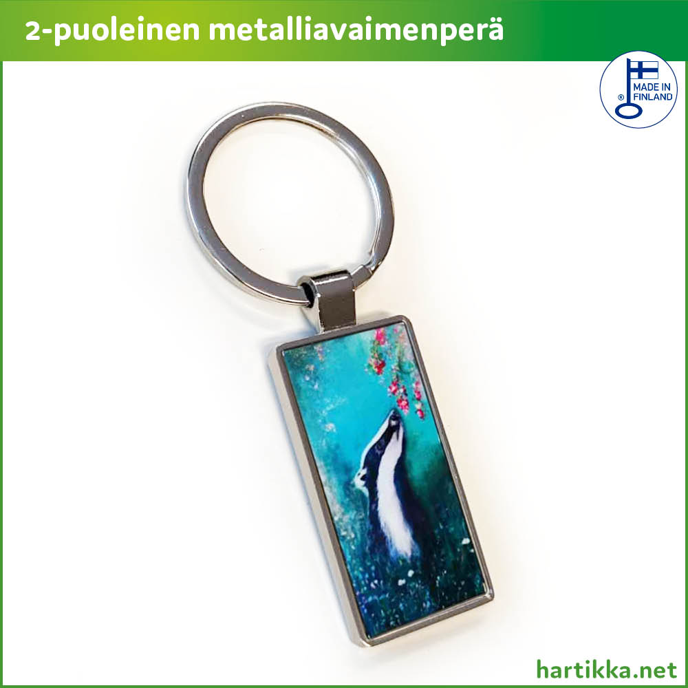 Kaksipuolinen avaimenperä, jossa molemmin puolin painettava 20 x 40 mm metallilaatta. Jämäkkä metallirunko, kompakti muotoilu. Tuote painetaan ja kootaan meillä.
