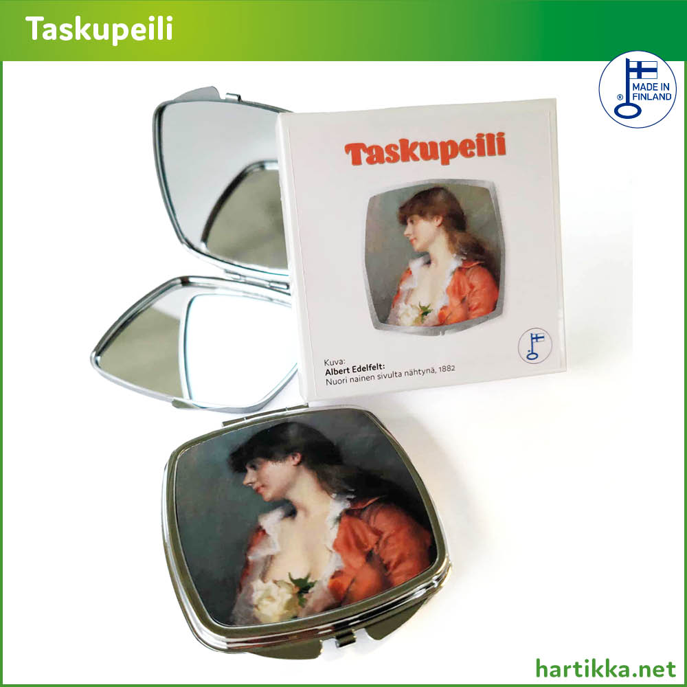 Kätevä ja nätti, metallirunkoinen taskupeili, johon saa mieleisen kuvan kanteen. Kuvan koko 58 x 58 mm, tyylikkäästi pyöristetty neliö. Kokonaismitat 66 x 73 x 8 mm, ja peili pakataan vaaleaan kartonkikoteloon (80 x 80 x 11 mm), jossa etiketissä kuva tuotteesta. Etikettiäkin voidaan kustomoida.